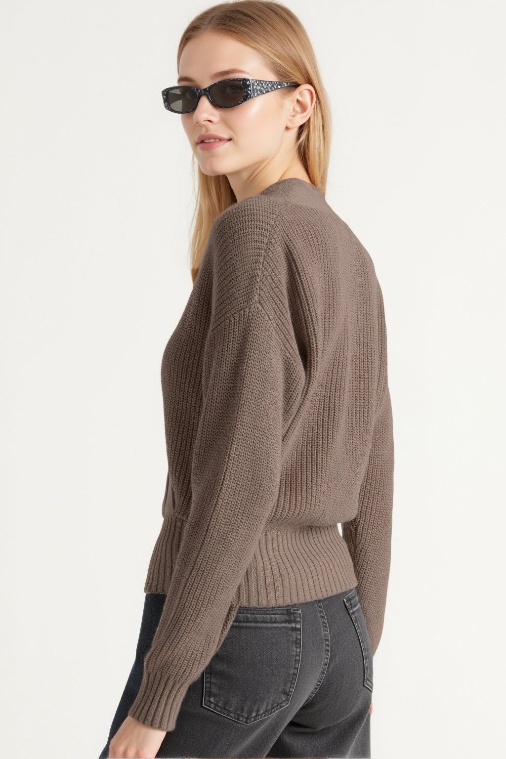 A chic, cropped V-neck sweater with a soft cross-front detail that adds movement and shape. It can be worn on or off the shoulders, offering an effortless way to elevate your fall looks.